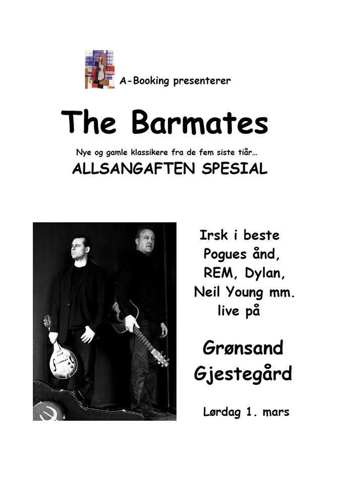Vi er så heldige som har fått The Barmates til å holde en allsang-aften på Grønsand, lørdag 1. mars! Vi har hørt dem i flere sammenhenger, og de skaper fabelaktig stemning. Bandet spiller Knudsen & Ludvigsen, Postgirobygget, Lillebjørn Nilsen, Simon & Garfunkel, Hellbillies, Monty Python, The Beatles, Prøysen, irsk folk, Peter Seeger, Hovedøen, Bjelleklang, Bob Dylan, Manfred Mann, Halvdan Sivertsen, Cornelis Vreeswijk. Det blir sanghefter og allsang og selvsagt gode dansemuligheter!