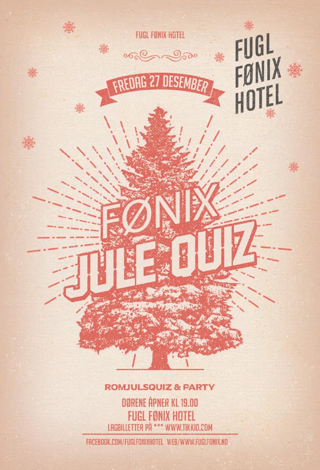 Fønix Romjulsquiz med 7 og 8 mannslag + Party. Man bestiller lagbillett på Tikkio.com – Husk å legge til lagnavn på toppen ved utsjekk i feltet «Lag, organisasjon eller firma» Dørene åpner 19.00 og quizen starter 20.00