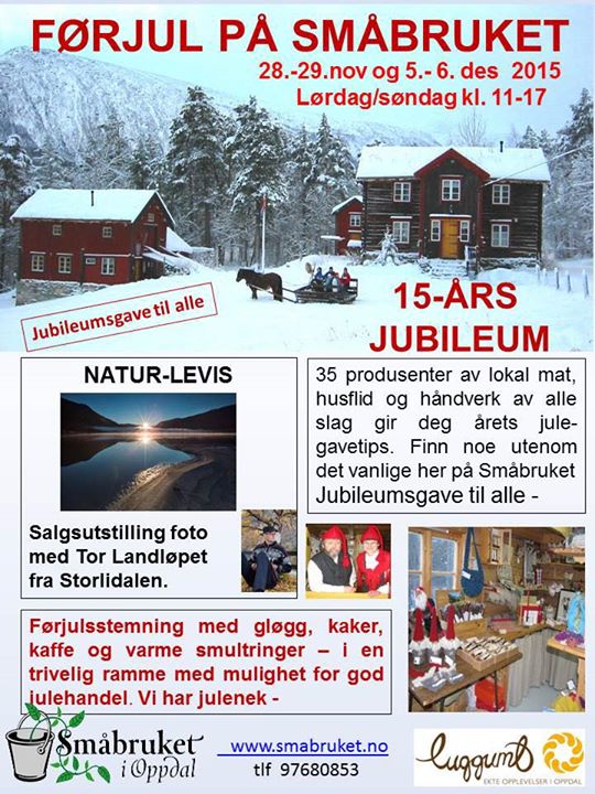 « All Hendelser Beklager. Denne hendelse har allerede funnet sted. Førjul på Småbruket 28. november 2015 @ 11:00 - 29. november 2015 @ 17:00|Gjentakende Hendelse (Se alle)Weekly on the same day until 6. December 2015 Hendelse Navigasjon « Rakfiskaften på Teveltunet Fjellstue Julemarked » + Google kalender+ iCal eksport Detaljer Start: 28. november 2015 @ 11:00 Slutt: 29. november 2015 @ 17:00 Hendelse Kategori: Sør-Trøndelag Hjemmeside: https://www.facebook.com/187889581221835/photos/a.735383449805776.1073741831.187889581221835/1057838617560256/?type=3&permPage=1 Arrangør Småbruket urtegård og pipemakeri Telefon: 97680853 Epost: smabruket@oppdal.com Hjemmeside: www.smabruket.no Sted Småbruket i Oppdal 7342 Lønset Oppdal, Sør-Trøndelag 7342 Norge + Google Map Telefon: 97680853 Relatert Hendelser Pilegrimsvandring – seks dager på St. Olavsleden mai 23 - mai 29