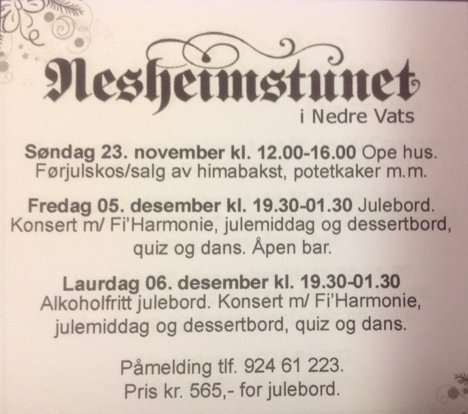 Velkommen til førjulskos på Nesheimstunet! Søndag 23. november inviterer vi til hyggelig lag fra kl 12-16. Salg av lefser, potetkaker, pyntegrønt, kranser, råmelkspudding, syltetøy, hjemmesydde klær m.m.