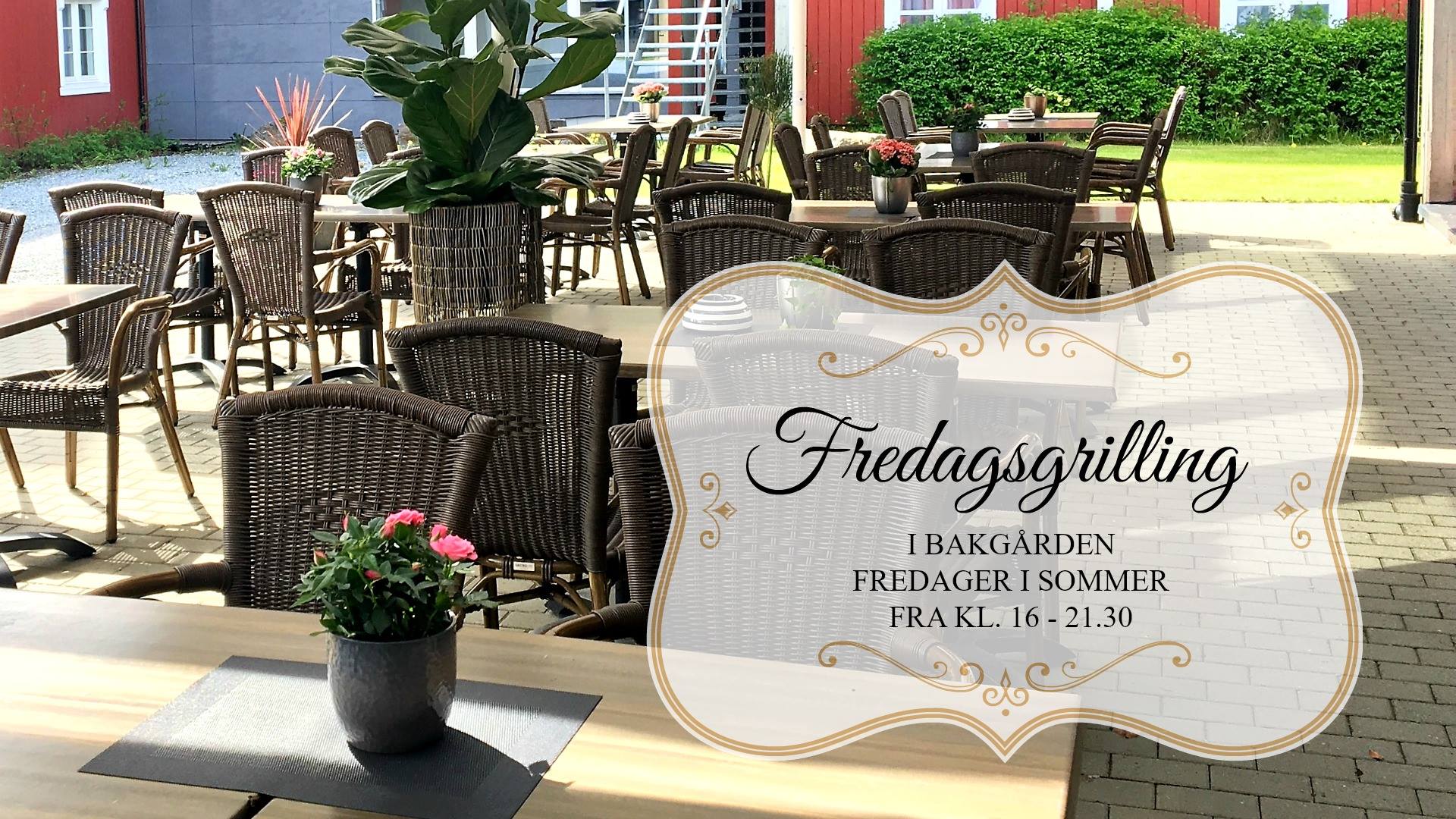 Fredager i sommer griller vi i bakgården. Vi serverer fisk, kjøtt, salater, brød og annet godt tilbehør og du forsyner deg med det du ønsker.