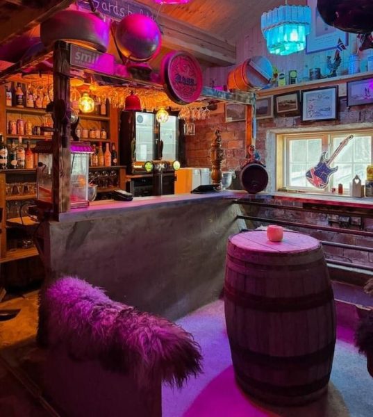 Vi har innredet grisehuset som pub og inviterer naboer og alle andre til hyggelig samvær hos oss.