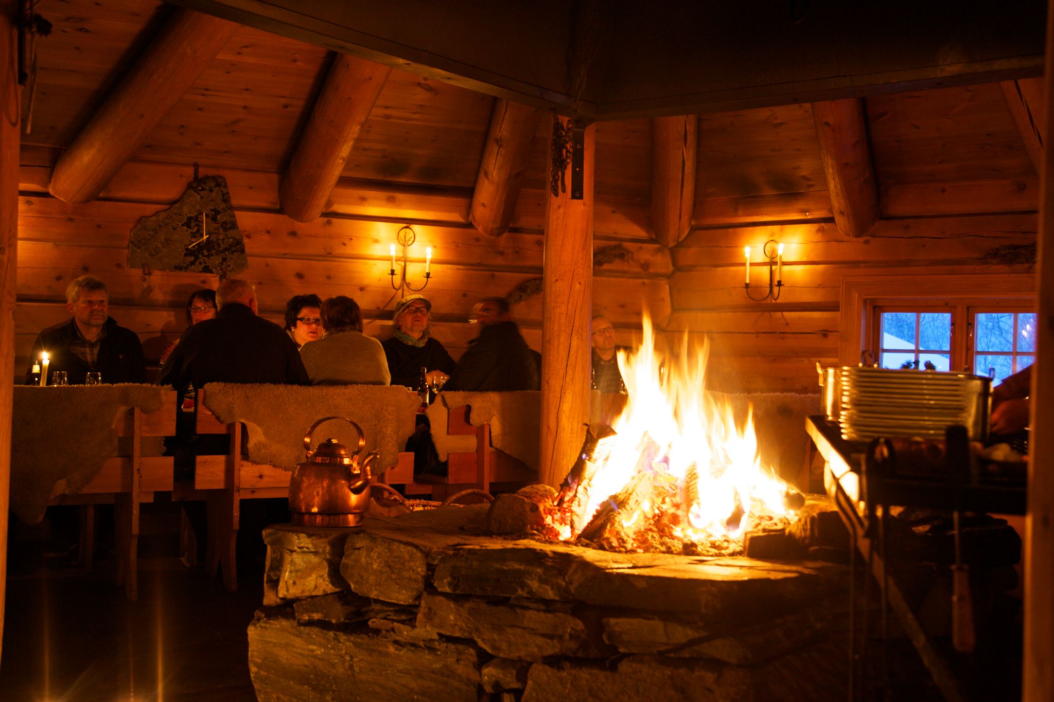 I et bygg tuftet på gamle byggetradisjoner i tømmer og sten, blir det en spesiell stemning rundt bålet med lekende toner fra lokale spellmenn.