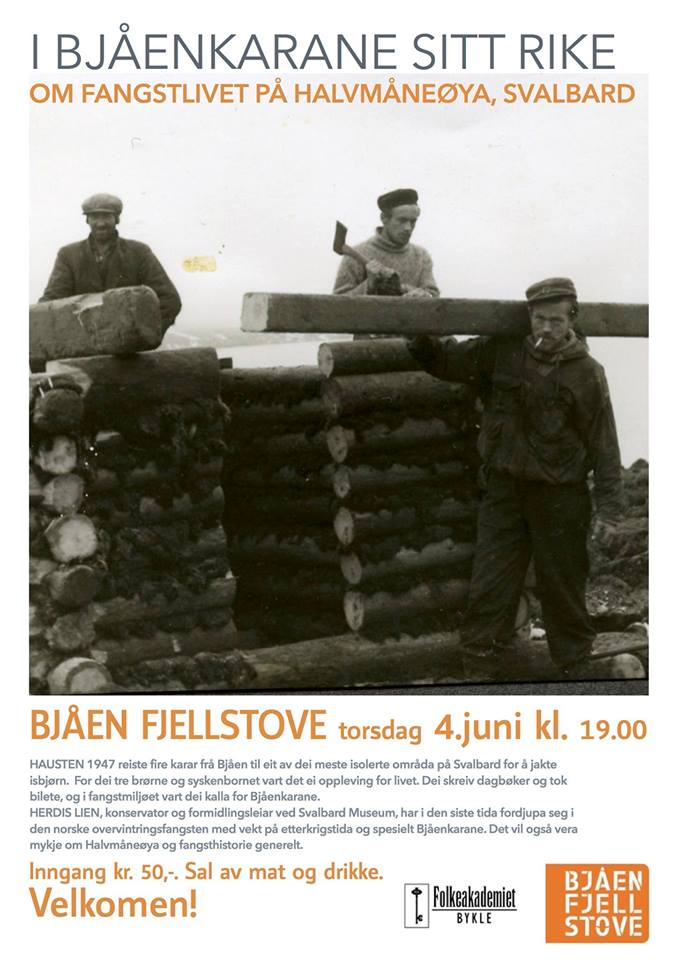 Torsdag 4. juni kl. 19.00 kjem Herdis Lien, konservator og formidlingsleiar frå Svalbard Museum, for å fortelje og vise bilete frå Bjåenkarane si overvintring. Ho har fordjupa seg i overvintringsfangsten på Svalbard i etterkrigstida, med spesiell vekt på Bjåenkarane. Føredraget vil også handle om Halvmåneøya og fangsthistorie generelt.
