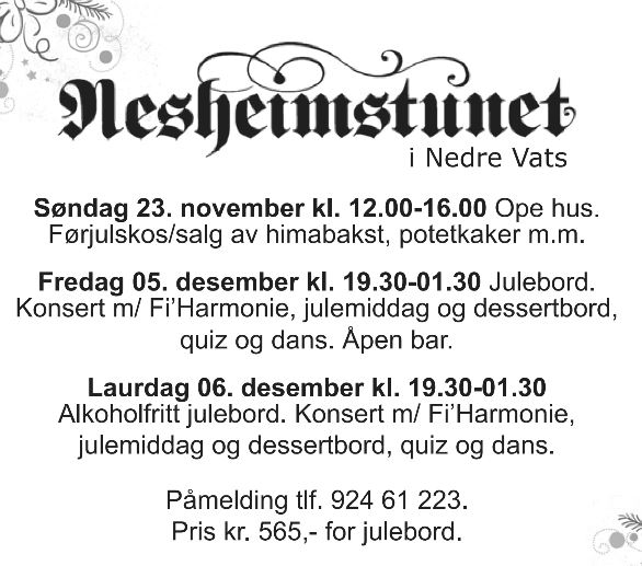 6. desember ønsker vi velkommen til julebord, og konsert med Fi’Harmonie! Det blir julemiddag og dessertbord, quiz og dans! Baren er åpen.