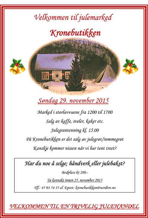 « All Hendelser Beklager. Denne hendelse har allerede funnet sted. Julemarked i Kronebutikken 29. november 2015 @ 12:00 - 17:00 Hendelse Navigasjon « Jolejazz 2015 Gårdskafé på Øvre Sukke Gård » + Google kalender+ iCal eksport Detaljer Dato: 29. november 2015 Tid 12:00 - 17:00 Hendelse Kategori: Troms Hjemmeside: https://www.facebook.com/kronebutikkeneiendom/photos/a.362795580503916.1073741829.349178288532312/849235585193244/?type=3&theater Arrangør Kronebutikken Telefon: 450 35 435 Epost: kronebutikken@nordtro.no Hjemmeside: www.kronebutikken.no Sted Kronebutikken Hovedveien 36 A Sørkjosen, 9152 + Google Map