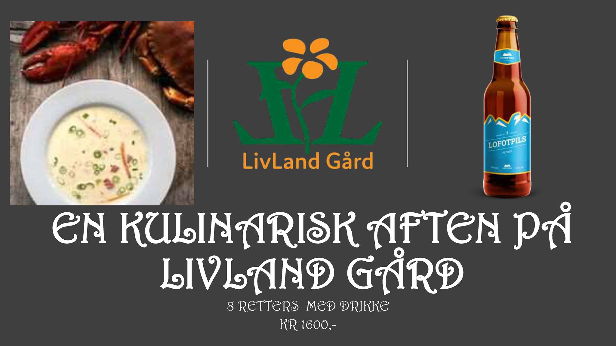 Vi på LivLand gård er stolt av å kunne invitere til en kulinarisk aften 31. oktober 2020. Her vil det bli servert en 8 retters meny som gjenspeiler vår fantastiske matregion. Herlige retter med mat fra både sjø og land. For å gjøre måltidet komplett vil vi det også bli servert god drikke som passer maten.