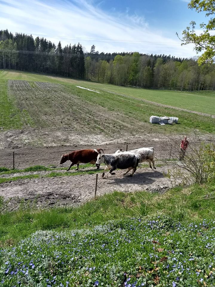 Kuene har i mange dager stått med lengselsfult blikk ved gjerdet og ventet på at gresset blir tilgjengelig for dem – de første grønne jafs fra årets nye gress. Ikke rart de løper og spretter litt før de begynner den intense beitingen!