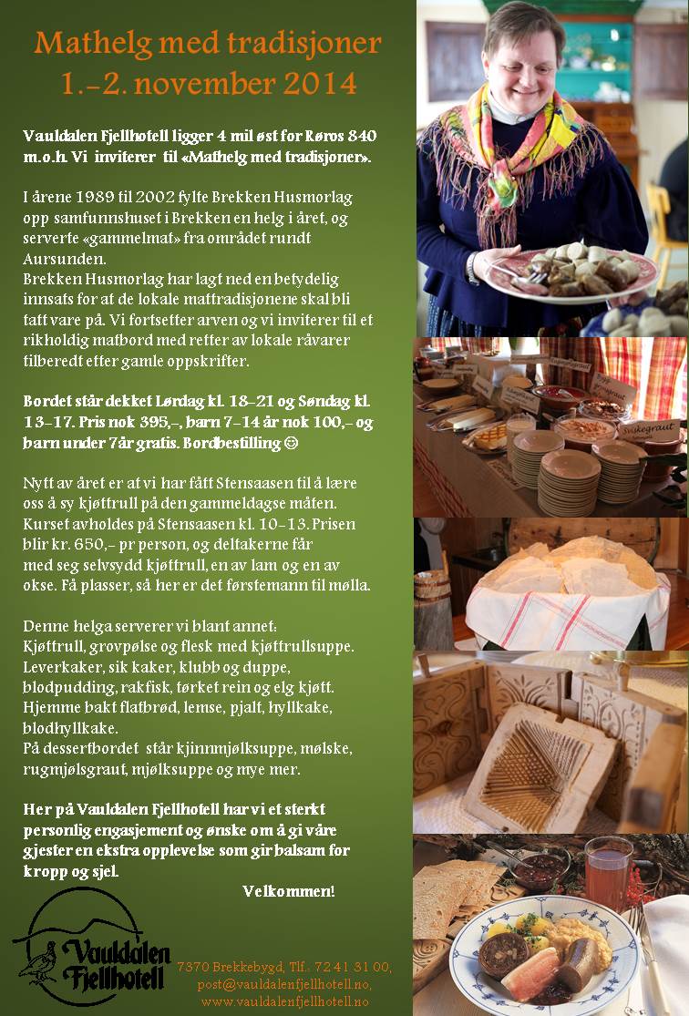 Vauldalen Fjellhotell inviterer til Mathelg med tradisjoner! En helg med «gammelmat» på alle fat – en arv etter Brekken Husmorlag, som har lagt ned en betydelig innsats for at de lokale mat-tradisjonene skal bli tatt vare på. Vi fortsetter arven og inviterer til et rikholdig matbord med retter av lokale råvarer tilberedt etter gamle oppskrifter. Bordet står dekket lørdag kl. 18 – 21, og søndag kl. 13 – 17. Pris voksen: 395,- / pris barn 7 – 14 år: 100,- / barn under 7 år: gratis. Husk å bestille bord på forhånd.