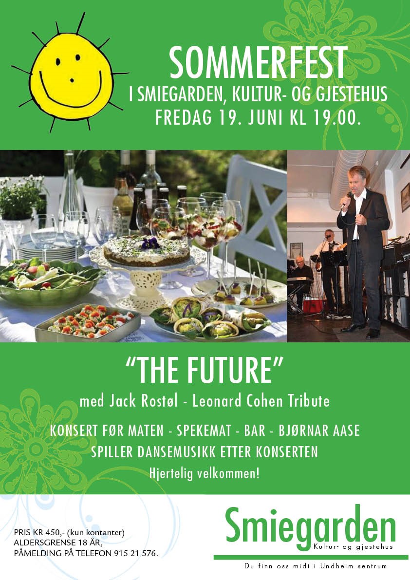 Den årlige sommerfesten i Smiegarden, kultur- og gjestehus på Undheim arrangeres den 19. juni, klokken 19:00. Musikken og maten er inkludert i prisen. Alle over 18 år er hjertelig velkommen!