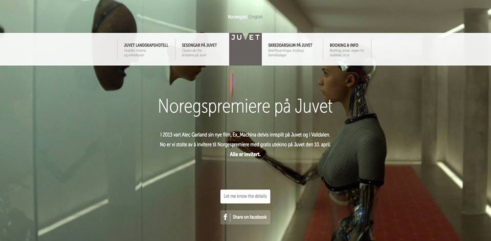 I 2013 ble Alex Garland sin nye film «Ex Machina» innspilt på Juvet og i Valldal. No er vi i samarbeid med Norddal kommune stolte over å kunne invitere til norgespremiere med gratis utekino på Juvet 10. april.