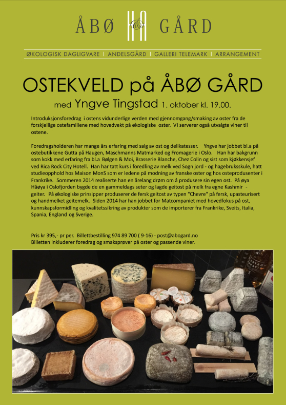Introduksjonsforedrag i ostens vidunderlige verden med gjennomgang / smaking av oster fra de forskjellige ostefamiliene, med hovedvekt på økologiske oster. Vi serverer også utvalgte viner til ostene.