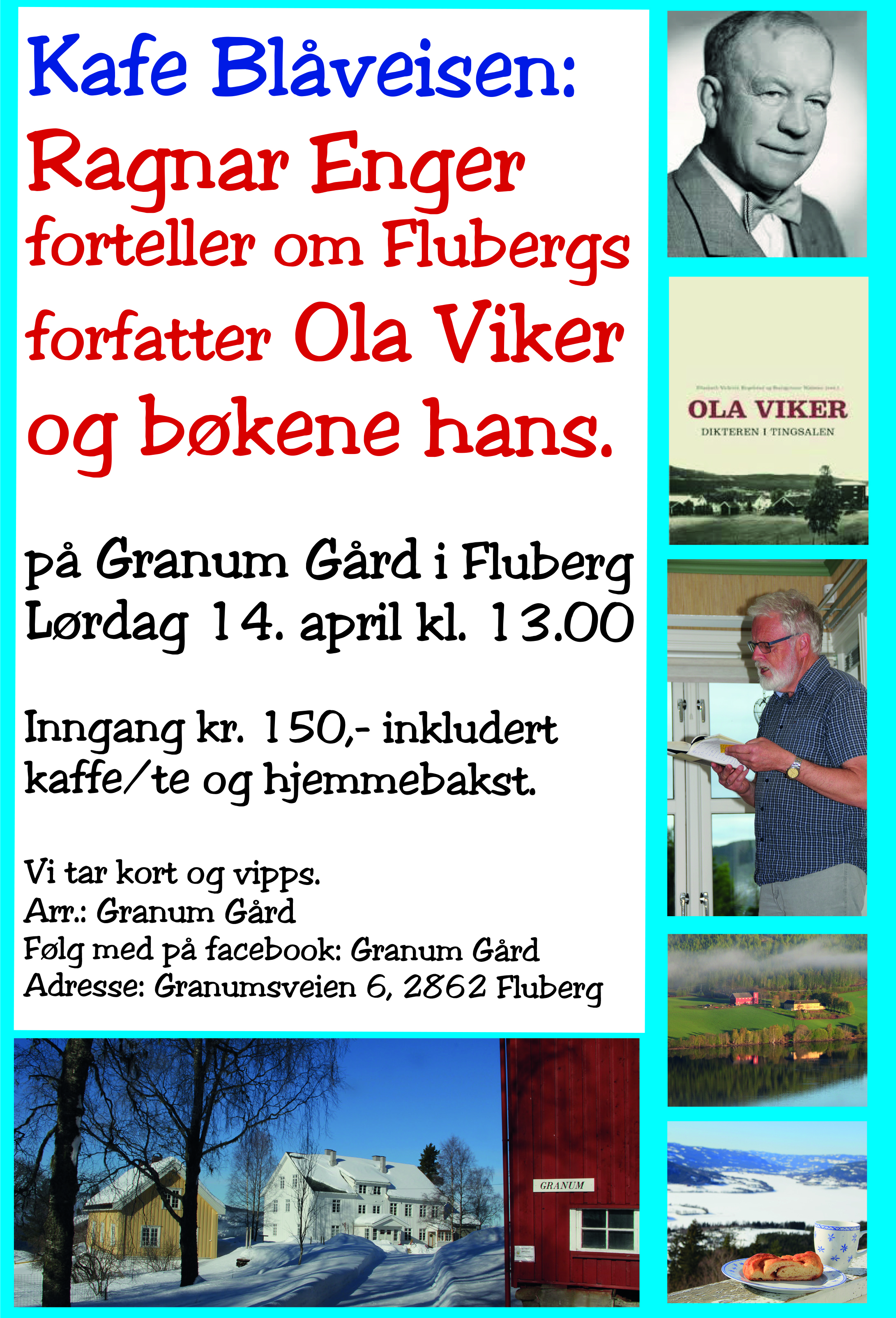 Ragnar Enger forteller om Flubergs forfatter:Ola Viker. Ragnar er en eminent forteller med mye kunnskap. Han bringer oss inn i Vikers bøker og verden. Ola Viker var en dyktig forfatter som vi vil få fram i lyset igjen. På Granum kan du sitte å se ned på Ola Vikers Gård som ligger vakkert ved Randsfjorden. Kafe Blåveisen er åpen. Inngang kr. 150,- inkludert kaffe/te og hjemmebakst. Arrangør: Granum Gård i Fluberg