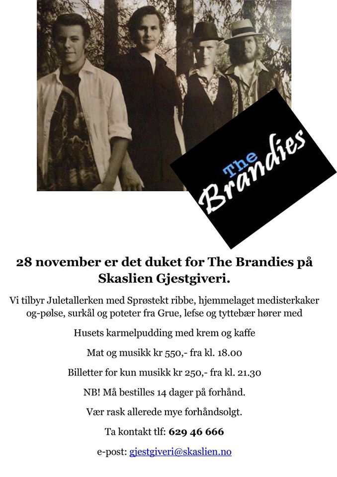 Fredag 28.november spiller The Brandies på Skaslien Gjestgiveri. Vi tilbyr Juletallerken (sprøstekt ribbe, hjemmelagede medisterkaker og -pølser, surkål m.m.) kl.18:00. Pris for middag og musikk er kr. 550,- Konserten starter 21:30, pris for bare konsert er kr. 250,- Bestilling må gjøres i forkant da det allerede er en del forhåndsolgte billetter. Ta kontakt på tlf: 62 94 66 66, eller på e-post gjestgiveri@skaslien.no