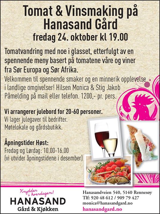 Velkommen til tomatvandring med noe i glasset, etterfulgt av en spennende meny basert på tomatene våre og viner fra Sør-Europa og Sør-Afrika! Pris: 1200,- pr. pers. Påmelding via e-post eller telefon. Hilsen Monica og Stig Jakob.