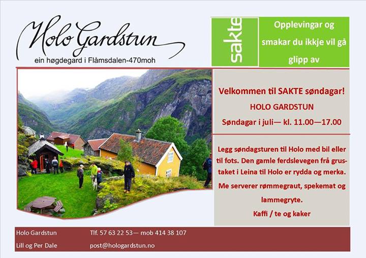 Søndagar i juli vil me ha opent for servering av rømmegraut, spekemat og lammegryte. Kaffi og kaker. Me har opent frå kl 11:00 til 17:00. Ein fin søndagstur er å gå frå grustaket i Leina og opp den gamle ferdslevegen / driftevegen til Holo. Flåm skule har gjort ein god jobb med rydding og merking av stien, så det skal vera lett å finna fram. Meir om dette på http://www.flaam.skule.no/?artID=996&navB=1 Turen opp frå Leina vil ta ein god time. Velkomen!