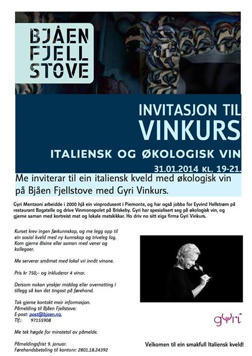 Velkomen til ein italiensk kveld med økololgisk vin og småmat med lokal vri på Bjåen Fjellstove! Kurset krev ingen førkunnskap, og me legg opp til ein sosial kveld med ny kunnskap og triveleg lag. Kom gjerne åleine, saman med vener eller kollegaer! Dersom nokon ynskjer overnatting så kan det tingast på førehand. Påmelding innan 9.januar.